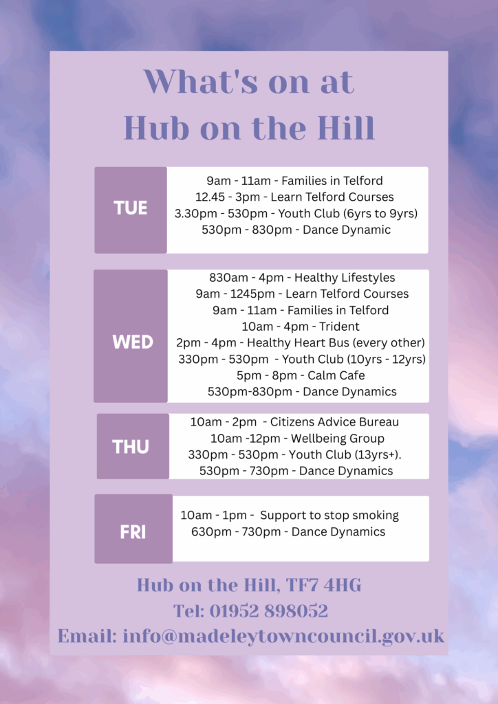 Madeley Town Council is proud to now be running the Hub on the Hill after the Trust running the building decided to step down.